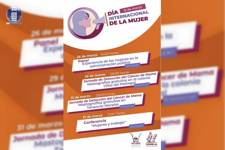 NOTICIAS 24/03/2021Continúa IMUJERIS la programación en el mes de marzo, en el marco del Día Internacional de la MujerPara dar continuidad al programa que el Gobierno de Morelia realizó con motivo del Día Internacional de la Mujer, el Instituto Municipal de la Mujer para la Igualdad Sustantiva (IMUJERIS), llevará a cabo hasta el 31 de marzo, diversas actividades virtuales y presenciales en favor de las morelianas.