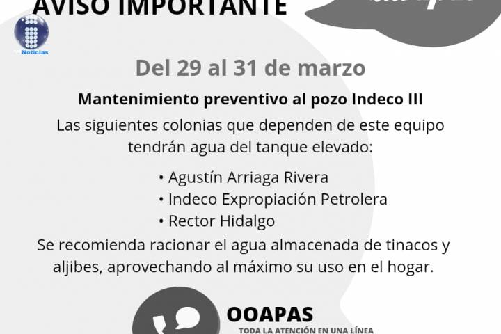 NOTICIAS 28/03/2021Dará OOAPAS mantenimiento preventivo al pozo Indeco IIIEl Organismo Operador de Agua Potable, Alcantarillado y Saneamiento de Morelia (OOAPAS) informa que del 29 al 31 de marzo se dará mantenimiento al pozo Indeco III para optimizar su funcionamiento; se llenará el tanque elevado para que las colonias que dependen de este equipo puedan recibir agua en sus tomas, sin embargo se recomienda tomar medidas de ahorro al usar agua en actividades domésticas.