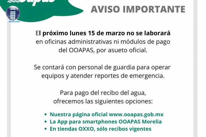 NOTICIAS 14/03/2021Este lunes, no se laborará en las oficinas administrativas ni módulos del OOAPASEl Organismo Operador de Agua Potable, Alcantarillado y Saneamiento de Morelia (OOAPAS), informa que debido al asueto señalado en el calendario oficial con motivo del Aniversario del Natalicio de Benito Juárez, el próximo lunes 15 de marzo no se laborará en las oficinas administrativas ni módulos de pago de esta paramunicipal.