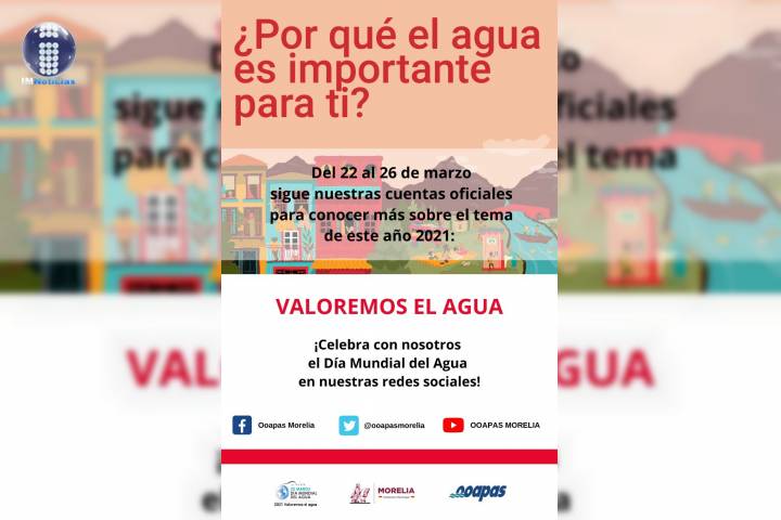 NOTICIAS 22/03/2021Con actividades, se suma OOAPAS a conmemoración del Día Mundial del AguaDel 22 al 26 de marzo, el Organismo Operador de Agua Potable, Alcantarillado y Saneamiento de Morelia (OOAPAS) celebrará de forma virtual el Día Mundial del Agua con publicaciones de videos e infografías a través de las redes sociales oficiales de la paramunicipal, abordando el tema designado este año por la Organización Mundial de las Naciones Unidas (ONU), que es "Valoremos el agua". El objetivo es fomentar la reflexión ciudadana sobre l... Ver más...
