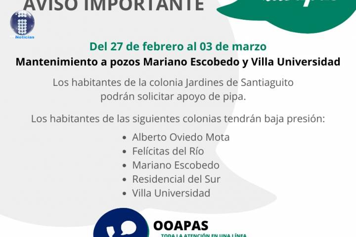 NOTICIAS 26/02/2021Continuará Gobierno de Morelia con mantenimiento a pozos de aguaEl Organismo Operador de Agua Potable, Alcantarillado y Saneamiento de Morelia (OOAPAS) informa que del sábado 27 de febrero al 03 de marzo se dará mantenimiento integral a los pozos Mariano Escobedo y Villa Universidad, para optimizar su funcionamiento.