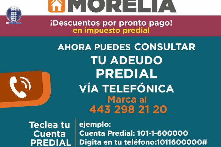 NOTICIAS 17/02/2021Habilita Gobierno de Morelia consulta rápida de predialComo parte de las acciones que el Ayuntamiento de Morelia realiza a través de la TesorerÃa Municipal, a favor del uso y aplicación de tecnologÃas de la información y las comunicaciones y asà hacer más eficaz el servicio a la ciudadanÃa y brindar alternativas ante la contingencia sanitaria, se ha instalado el servicio de consulta rápida a través de la lÃnea telefónica, para que las y los contribuyentes que asà lo requieran puedan acce... Ver más...