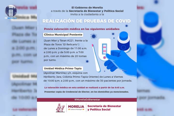 Bajo el compromiso de blindar la salud de las y los ciudadanos, el Gobierno de Morelia, a través de la SecretarÃa de Bienestar y PolÃtica Social, mantiene los trabajos de realización de pruebas gratuitas para detección temprana de COVID entre la población.