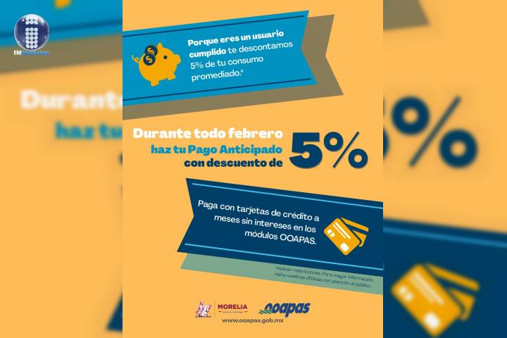 NOTICIAS 01/02/2021Gobierno de Morelia seguirá en febrero con programa "pago anticipado", descuento del 5%El Organismo Operador de Agua Potable, Alcantarillado y Saneamiento de Morelia (OOAPAS) mantendrá su Programa de Pago Anticipado durante el mes de febrero, con un descuento del 5 por ciento con base en el consumo promediado, para que más personas puedan aprovechar la promoción.