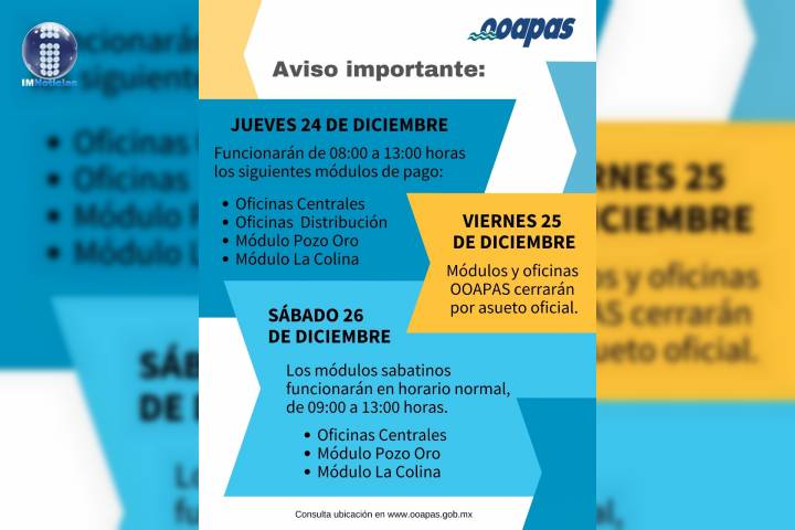 NOTICIAS 23/12/2020OOAPAS recuerda sus horarios de atención para época navideñaEl jueves 24 de diciembre los morelianos podrán pagar su recibo del agua y aprovechar la promoción de Pago Anticipado en cuatro (04) módulos de pago del Organismo Operador de Agua Potable Alcantarillado y Saneamiento de Morelia (OOAPAS), que estarán funcionando ese día en horario de 08:00 a 13:00 horas: