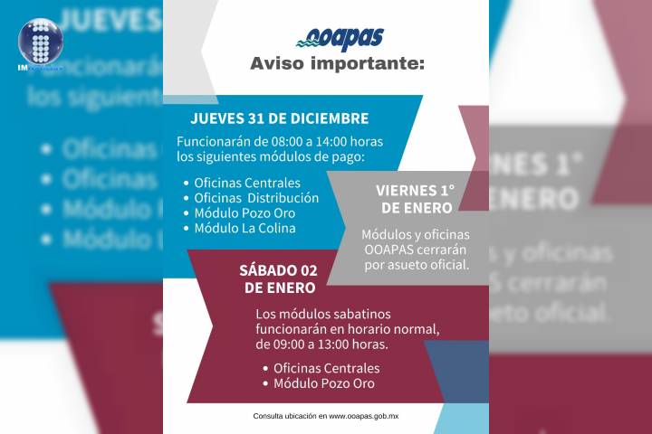 NOTICIAS 30/12/2020Aviso OOAPAS sobre horarios de atención el 31 de diciembre El jueves 31 de diciembre los morelianos podrán pagar su recibo del agua y aprovechar la promoción de Pago Anticipado en cuatro (04) módulos de pago del Organismo Operador de Agua Potable Alcantarillado y Saneamiento de Morelia (OOAPAS), que estarán funcionando ese día en horario de 08:00 a 14:00 horas: