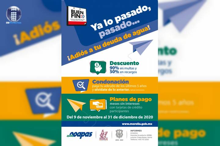 NOTICIAS 05/11/2020El 09 de noviembre inicia "el Buen Fin en el OOAPAS"En el marco de la tradicional promoción del Buen Fin, el Organismo Operador de Agua Potable, Alcantarillado y Saneamiento de Morelia (OOAPAS) preparó la promoción "Ya lo pasado, pasado? ¡Adiós a tu deuda del agua!" para invitar a los usuarios con rezago a ponerse al corriente en su recibo del agua, aprovechando las opciones de descuentos que la paramunicipal ha preparado.