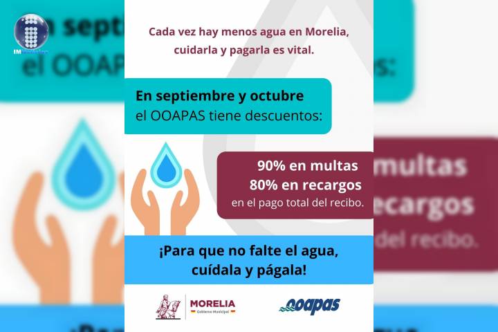 NOTICIAS 30/08/2020El OOAPAS Arranca Programa De Descuentos En Multas Y RecargosA partir de este martes, el Organismo Operador de Agua Potable Alcantarillado y Saneamiento de Morelia (OOAPAS) arrancará un programa de descuentos llamado "Para que no falte el agua, cuídala y págala", dirigido a los usuarios que presentan rezago en su recibo del agua, para que puedan ponerse al corriente.