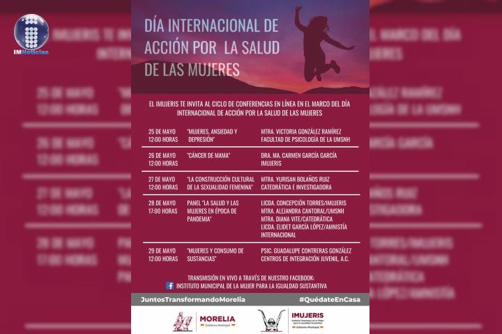 NOTICIAS 21/05/2020Realiza IMUJERIS ciclos de conferencias en línea El Instituto Municipal de la Mujer para la Igualdad Sustantiva (IMUJERIS), realizará un ciclo de conferencias y un panel en línea con motivo del Día Internacional de Acción por la Salud de las Mujeres, que se conmemora el próximo 28 de mayo.
