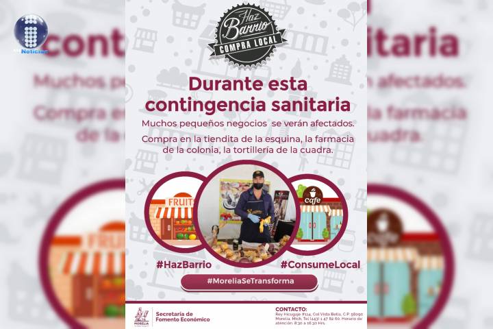 NOTICIAS 19/03/2020Gobierno de Morelia promueve consumo local ante contingencia El Gobierno de Morelia invita a la ciudadanÃa a realizar consumo local en tiendas de sus colonias o tenencias, farmacias y tortillerias de su barrio o comunidad a fin de que la economÃa de los pequeños negocios se vea lo menos afectada por la contingencia epidemiológica generada por el coronavirus COVID-19.