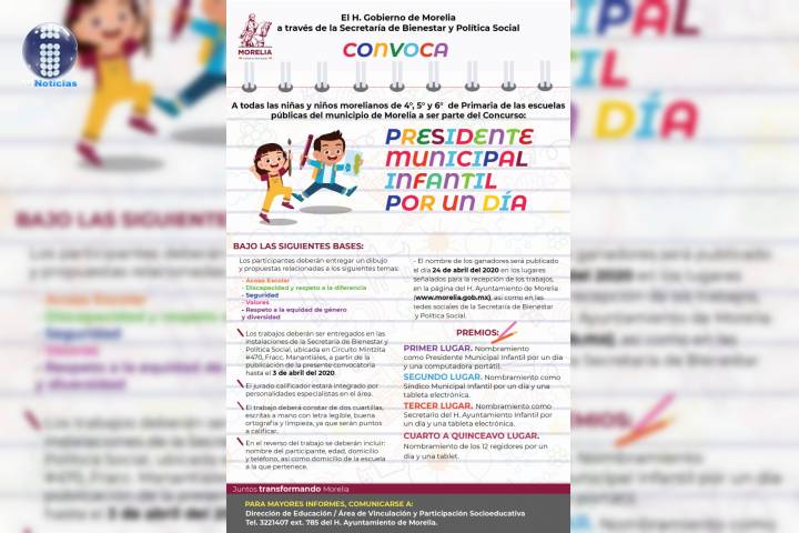 NOTICIAS 04/03/2020Convoca Gobierno de Morelia al concurso "Presidente Municipal Infantil por un dÃa"