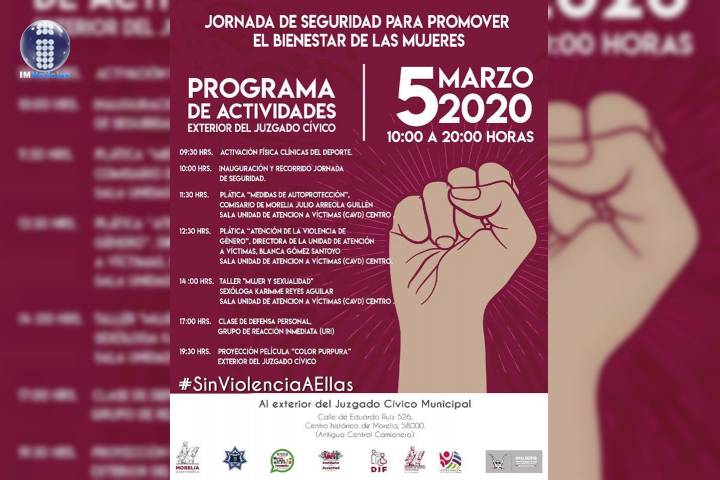 NOTICIAS 04/03/2020Alista Gobierno de Morelia Jornada de Seguridad para Promover el Bienestar de las MujeresCon el fin de conmemorar de forma digna el DÃa Internacional de la Mujer y organizar una serie de actividades, pláticas y talleres, en favor de la inclusión, perspectiva de género y su protección, el Gobierno de Morelia, alista una Jornada de Seguridad para Promover el Bienestar de las Mujeres, el dÃa de mañana jueves 5 de marzo, de 10:00 a 20:00 horas, en las instalaciones del Juzgado CÃvico, en el Centro Histórico.