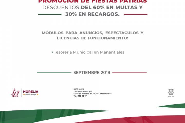 NOTICIAS 26/09/2019Tesorería Morelia invita a aprovechar últimos 4 días de descuento en contribuciones municipalesSe otorgan facilidades para los morelianos que tienen algún rezago en sus contribuciones. Tesorería invita a aprovechar los últimos 4 días del programa ¡Independízate de tú deuda!, el cual ha tenido una buena respuesta de la ciudadanía.