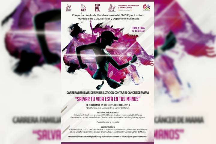 NOTICIAS 26/09/2019Invita DIF Morelia a Carrera Familiar de Sensibilización contra el Cáncer de MamaComo muestra del compromiso con la prevención y la atención a la salud de las mujeres del municipio, el Gobierno de Morelia a través del DIF, ha desplegado una serie de actividades que se desarrollarán dentro del marco del mes de octubre por el Día Mundial de la lucha contra el cáncer de mama.