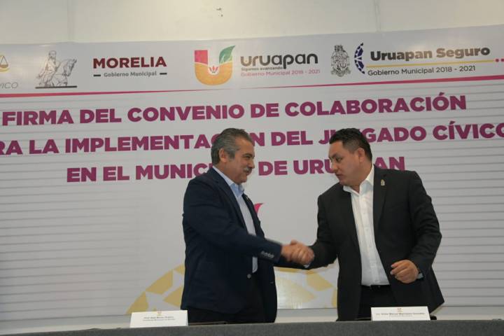 NOTICIAS 11/07/2019En fomento de un sistema de justicia cívica, estrechan lazos Morelia y UruapanAl reconocer en este sistema un modelo que se encuentra a la vanguardia y que ha traído grandes resultados en lo que a prevención del delito se refiere, el Ayuntamiento de Morelia, signó un acuerdo con el del municipio de Uruapan, por medio del cual le brindará la asesoría necesaria para lograr la implementación de juzgados cívicos.