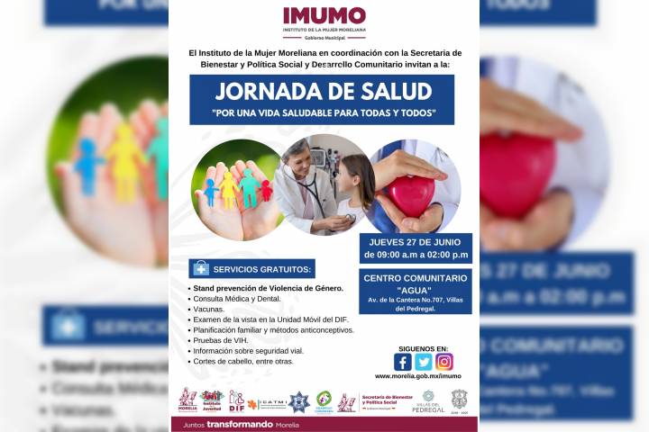 NOTICIAS 22/06/2019Promoverá Ayuntamiento derechos de las mujeres mediante una jornada de saludEn lo que representa un pleno ejercicio de los derechos de las mujeres, diversas dependencias del Ayuntamiento, en coordinación con organizaciones e instancias del gobierno federal, realizarán una jornada de salud el próximo 27 de junio en Villas del Pedregal, en donde podrán someterse a diversos métodos de detección de enfermedades y atención psicológica, de manera gratuita.