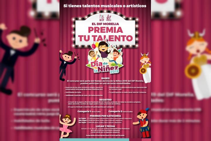 NOTICIAS 09/04/2019Morelia vivirá "Día de la Niñez 2019", festejo llegará a las 14 tenenciasEl Ayuntamiento a través del DIF Morelia anunció el festejo "Día de la Niñez 2019", el cual es un evento inclusivo y con equidad para celebrar el Día del Niño del 22 al 30 de abril, en las 14 tenencias y la ciudad con un magno evento programado para el 27 del presente mes y año en Plaza Valladolid a partir de las 12:00 horas.