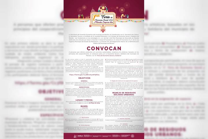 NOTICIAS 10/04/20191er Feria de Economía Social y Solidaria de Morelia, espacio para productos o servicios sustentables y creativos La Secretaría de Fomento Económico abre la convocatoria a todas las personas que ofrezcan productos o servicios sustentables, creativos y artísticos a que participen en la 1er Feria de Economía Social y Solidaria 2019 "Morelia Coopera-Tiva" que se llevará a cabo por primera ocasión en una administración municipal los días 4 y 5 de mayo del presente.
