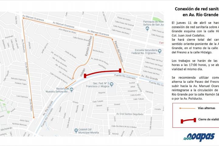 NOTICIAS 10/04/2019Este jueves el OOAPAS hará conexión de red sanitaria sobre la Av. Río GrandeEl Organismo Operador de Agua Potable Alcantarillado y Saneamiento de Morelia (OOAPAS) informó que el próximo jueves 11 de abril del presente se llevará a cabo la obra del cruce de red sanitaria ubicada sobre la Av. Río Grande en la esquina con la calle Hidalgo, a la altura de la colonia Juan José Codallos. Por esta razón será necesario hacer cierre total del carril que va en sentido oriente-poniente de la Av. Río Grande, en el tramo que ... Ver más...