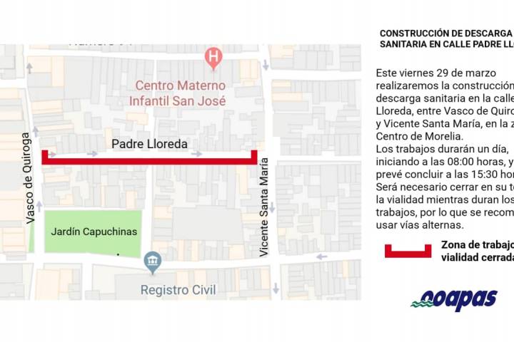 El Organismo Operador de Agua Potable Alcantarillado y Saneamiento de Morelia (OOAPAS) informa que el próximo viernes 29 de marzo se llevará a cabo la construcción de una descarga sanitaria ubicada sobre la calle Padre Lloreda, en la zona Centro de la ciudad. Por esta razón será necesario hacer cierre total de la circulación de esta calle, en el tramo que va de la calle Vasco de Quiroga a la Calle Vicente Santa MarÃa, de la zona Centro d... Ver más...