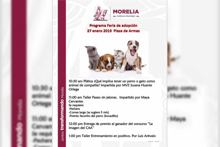 NOTICIAS 26/01/2019Talleres, pláticas y más, en la Feria de AdopciónCon el propósito de continuar fomentando el respeto a la vida animal, el Ayuntamiento de Morelia que preside el Alcalde, Raúl Morón Orozco, invita a la ciudadanía a participar en la próxima Feria de Adopción.
