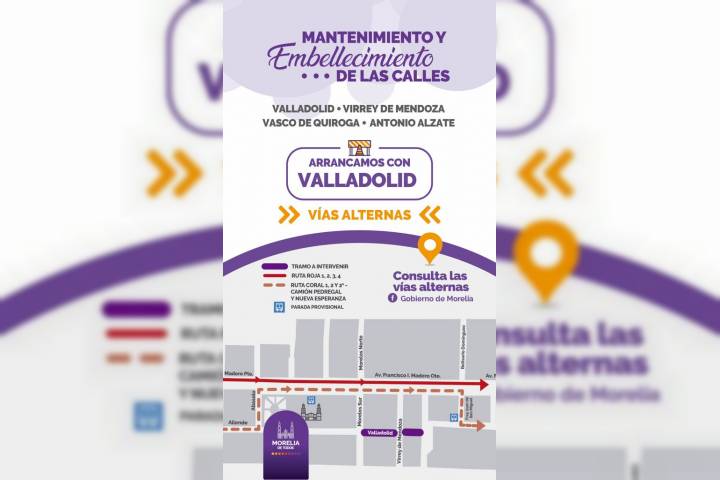 NOTICIAS 06/08/2018Ayuntamiento de Morelia reitera vías de circulación alternas a Calle ValladolidCon el propósito de seguir dotando de vialidades duraderas y de calidad al municipio, el Ayuntamiento de Morelia a través de la Secretaría de Desarrollo Metropolitano e Infraestructura, invita a la ciudadanía en general a hacer uso de las vías de circulación alternas a la obra de Mejoramiento y Embellecimiento de la calle Valladolid en el Centro Histórico.