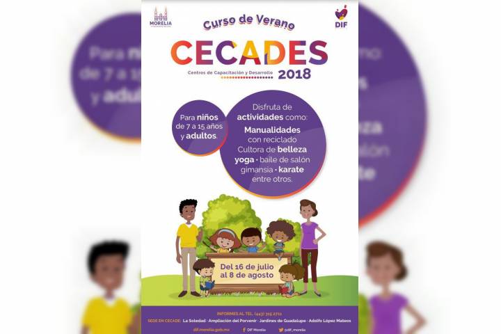 NOTICIAS 13/07/2018DIF Morelia ofrecerá atractivos Cursos de Verano en los CECADES Una vasta oferta de talleres para niños y adultos, ofrecerá el Sistema DIF Morelia a través de los Cursos de Verano que serán impartidos en los Centros de Capacitación y Desarrollo (CECADES), mismos que iniciarán el próximo 16 de julio y culminarán el ocho de agosto del presente año.