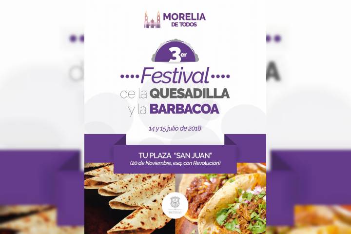 NOTICIAS 13/07/2018Todo listo para el "Tercer Festival de la Quesadilla y la Barbacoa" este fin de semana La Secretaría de Servicios Públicos Municipales, a través de su Dirección de Mercados, informó que se encuentra todo listo para que este fin de semana, tanto morelianos como turistas y visitantes disfruten del "3er Festival de la Quesadilla y la Barbacoa", que se llevará a cabo en la explanada de Tu Plaza "San Juan".