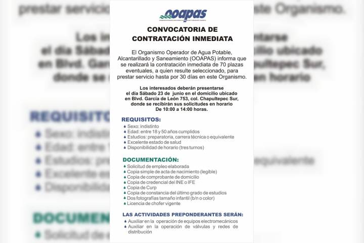 NOTICIAS 23/06/2018OOAPAS abre convocatoria para personal eventualCon el fin de seguir brindando el servicio al 100 por ciento a todo el municipio, el Organismo Operador de Agua Potable, Alcantarillado y Saneamiento de Morelia (OOAPAS) abrió la convocatoria para cubrir 70 plazas eventuales de forma inmediata y con duración hasta por 30 días.