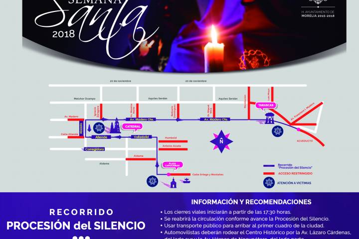 NOTICIAS 28/03/2018Todo listo para la Procesión del Silencio en MoreliaMorelia se encuentra lista para recibir a las miles de personas que se darán cita en el marco de la edición número 42 de la tradicional Procesión del Silencio, la cual recorrerá la Avenida Madero y culminará en el templo de Capuchinas en el marco del periodo vacacional de Semana Santa; así lo informó la Secretaria de Turismo de Morelia, Thelma Aquique Arrieta.