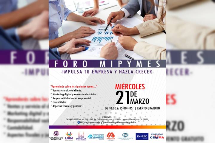 NOTICIAS 20/03/2018Foro de impulso a MIPYMES, este miércoles en el Colegio de Morelia Bajo la instrucción del Presidente Municipal de Morelia, Alfonso Martínez Alcázar, de llevar la capacitación a los ciudadanos e impulsar el sector económico, el Colegio de Morelia que encabeza Alejandro Amante Urbina realizará el Foro MIPYMES "Impulsa a tu empresa y hazla crecer" este próximo miércoles 21 de marzo de 10:00 a 15:00 horas, con entrada gratuita.
