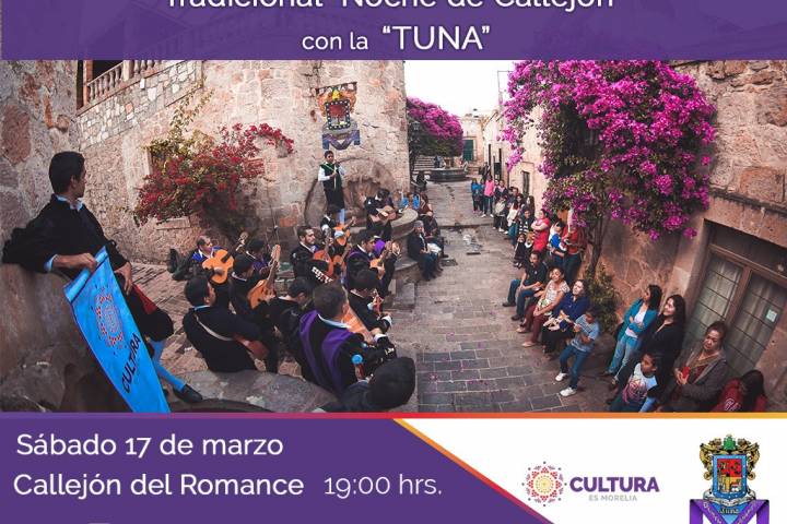 NOTICIAS 17/03/2018La Secretaría de Cultura de Morelia invita a "Gran Callejoneada" este sábado En la ruta de seguir promoviendo el arte entre toda la población, la Administración Municipal a través de la Secretaría de Cultura de Morelia (SECULMO), extiende una invitación a la "Gran Callejoneada", que se realizará en conjunto con la Tuna del Distrito Universitario de Michoacán en el marco de su XXVIII Aniversario, este sábado 17 de marzo a las 19:00 horas en el Callejón del Romance.