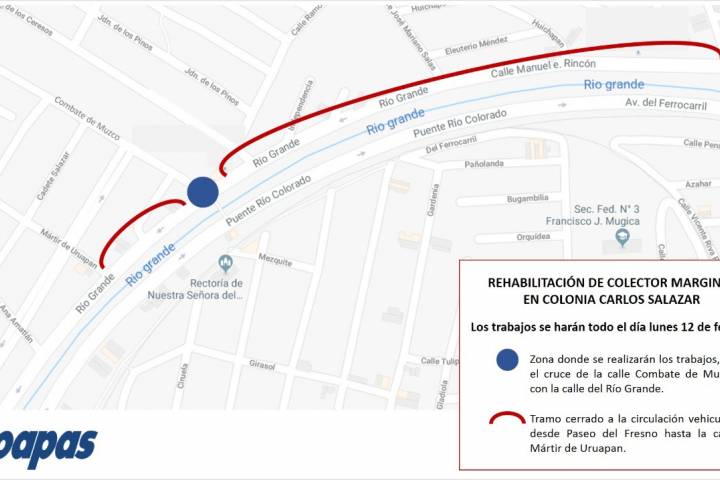 NOTICIAS 09/02/2018Próximo lunes, OOAPAS rehabilitará Colector Marginal en calle Combate de Muzco Con el fin de llevar servicios óptimos a la población moreliana, el Organismo Operador de Agua Potable, Alcantarillado y Saneamiento de Morelia (OOAPAS) realizará este lunes 12 de Febrero la rehabilitación del colector sanitario marginal que se ubica en el cruce de las calles Combate de Muzco y Río Grande, en la colonia Carlos Salazar.