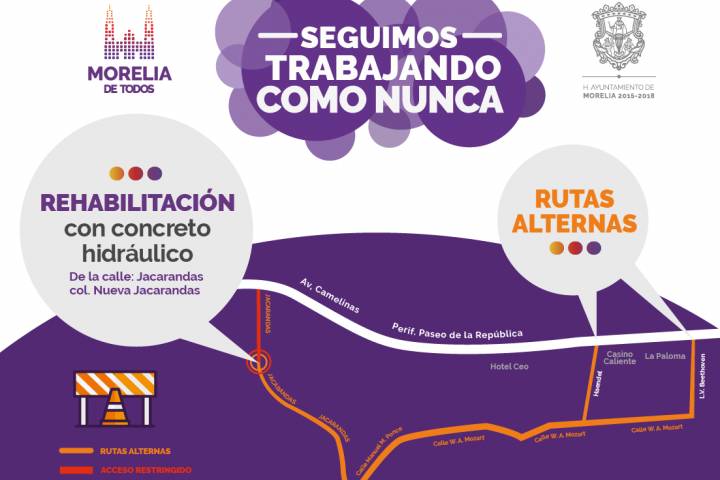 NOTICIAS 23/01/2018Ayuntamiento de Morelia rehabilitará la calle Jacarandas Con el objetivo de seguir haciendo obras como nunca y atender las necesidades de los ciudadanos, el Ayuntamiento de Morelia arrancará este miércoles 24 de Enero la rehabilitación integral de la calle Jacarandas en la colonia Nueva Jacarandas