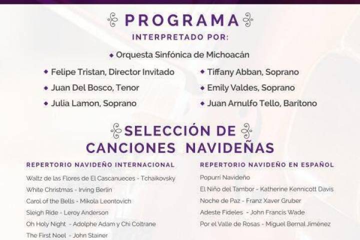Todo está listo para que los morelianos disfruten esta noche del 3er. Concierto Navideño "Música por una Sonrisa", que realiza el Gobierno de Morelia a través del Sistema DIF Municipal, precedido de forma honoraria por Paola Delgadillo de MartÃnez, evento de gran nivel dirigido a toda la familia, en donde podrán escuchar un repertorio musical internacional, asà como canciones en español bien conocidas por la ciudadanÃa como El Niño de... Ver más...