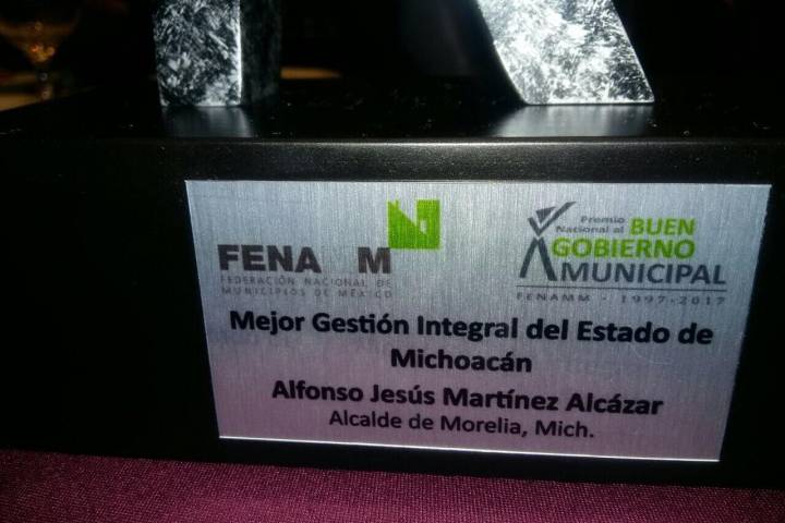 NOTICIAS 04/12/2017Recibe Alfonso "Premio Nacional del Buen Gobierno Municipal 2017" Por la gestión sobresaliente realizada por la actual Administración en el rubro de Hacienda Municipal, el Alcalde de Morelia, Alfonso Martínez Alcázar, se hizo acreedor al "Premio Nacional del Buen Gobierno Municipal 2017" en la categoría de Mejor Gestión Integral del Estado de Michoacán, por parte de la Federación Nacional de Municipios de México (FENAMM).