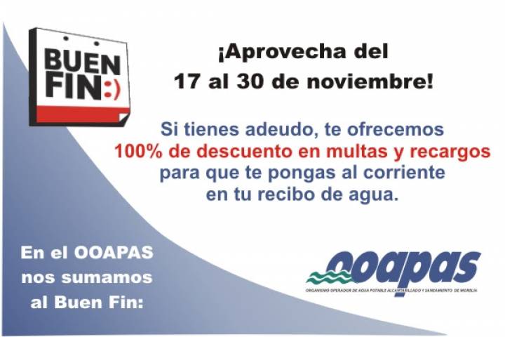 NOTICIAS 16/11/2017El OOAPAS se suma al "Buen Fin" El Organismo Operador de Agua Potable, Alcantarillado y Saneamiento de Morelia (OOAPAS) ya está listo para sumarse al Buen Fin con una promoción para los usuarios que presenten algún adeudo en su recibo de agua.