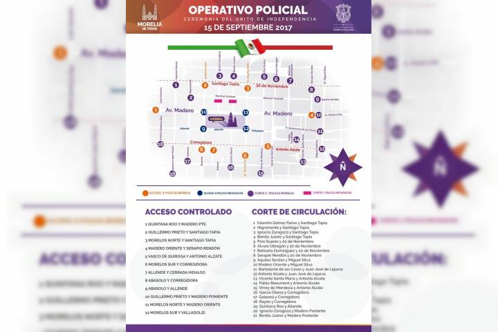 NOTICIAS 13/09/2017Anuncian cierres a la circulación en calles del Centro Histórico los dÃas 15 y 16 de Septiembre Con el firme objetivo de resguardar la seguridad de la ciudadanÃa y permitir que las celebraciones del mes patrio se lleven a cabo de manera ordenada y tranquila a lo largo del fin de semana, los Gobiernos Municipal y Estatal, anuncian que se desplegará un operativo a partir de las 22:00 horas del dÃa 14 de Septiembre que incluye el cierre de algunas de las vialidades del Centro Histórico de la Capital Michoacana y la distribución de arcos d... Ver más...