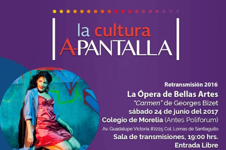 NOTICIAS 25/06/2017Acude ciudadanía a programa "La Cultura A-pantalla", en el Colegio de MoreliaComo parte del impulso a la cultura en el municipio se llevó a cabo el programa "La Cultura A-pantalla en el Colegio de Morelia, esta iniciativa impulsada por la Secretaría de Cultura Municipal y que es un proyecto del Instituto Nacional de Bellas Artes (INBA) que en conjunto pudo llevarse la retransmisión de la Ópera "Carmen".