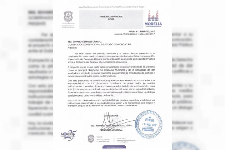 NOTICIAS 15/03/2017Morelia entrega Proyecto de Coordinación en materia de Seguridad al Gobierno En un ejercicio de voluntad y apertura franca para trabajar en conjunto en materia de seguridad, alineando estrategias y sumando fuerzas tendientes a establecer, en un esquema de respeto institucional, las tareas a desarrollar que resuelvan los grandes retos que ofrece la capital de Michoacán, ante ello, el Gobierno Municipal Independiente presentó este miércoles el Proyecto de Convenio General de Coordinación en materia de Seguridad Pública... Ver más...