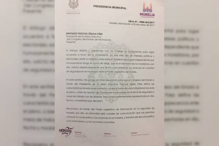 NOTICIAS 02/03/2017Pide Alfonso al Congreso que lo inviten a hablar de la policía de MoreliaEl secretario de Ayuntamiento de Morelia, Jesús Ávalos Plata, presentó ante el Congreso del Estado una misiva para pedir que dejen al presidente, Alfonso Martínez Alcázar, exponer sobre los avances en cuestión de seguridad en la capital michoacana.
