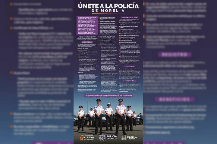 NOTICIAS 04/03/2017Invita Gobierno Municipal a formar parte de la Policía de Morelia Con la meta de hacer crecer a la Policía de Morelia y mantenerla en la ruta de que sea una corporación respetada, confiable y capacitada, el Comisionado Municipal de Seguridad, Bernardo León Olea, recordó que continúa abierta la convocatoria para que mujeres y hombres se unan a la institución municipal.