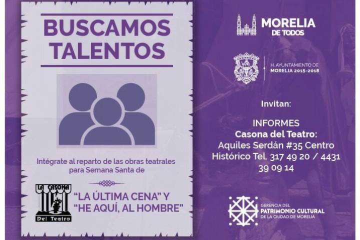 NOTICIAS 23/02/2017Gerencia del Patrimonio Cultural busca talento local Con el objetivo de hacer partícipe a la ciudadanía en la promoción de la cultura, la Gerencia del Patrimonio Cultural convoca a la población en general, que tenga facilidad para la actuación y el teatro a que se unan al elenco de las representaciones "La Última cena" y "He aquí, al hombre".