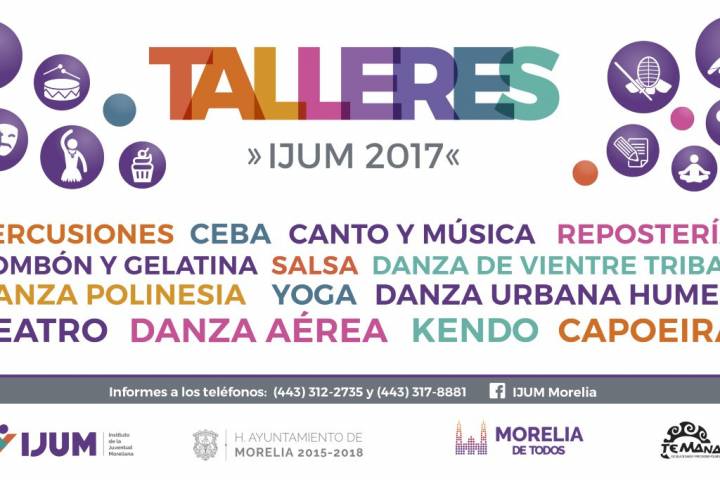 NOTICIAS 10/02/2017Instituto de la Juventud Moreliana da a conocer su vasta oferta de talleres para este 2017 Con el propósito de mantener los éxitos alcanzados en el 2016, el Instituto de la Juventud Moreliana que encabeza Ana Cristina Prado, se ha fijado como objetivo en el presente año, ofrecer a la ciudadanía una variedad de actividades que abonen al desarrollo físico y mental de la población juvenil, al tiempo de permitir a estos dar cauce a sus inquietudes artísticas.
