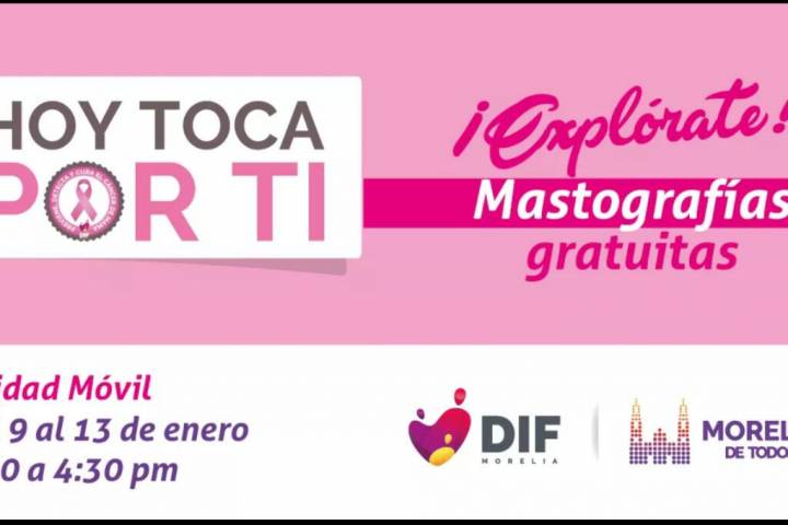 NOTICIAS 12/01/2017Últimos días de mastografías gratuitas en el DIF MoreliaCon el objetivo de promover la cultura de la prevención y fomentar la salud en el municipio, el DIF Morelia, otorgará hasta este viernes estudios de mastografía gratuitos a través de la unidad móvil, como parte de la campaña permanente "Hoy Toca Por Ti", con la que se busca disminuir la incidencia de casos de cáncer en la capital michoacana.