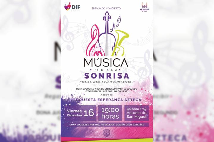NOTICIAS 15/12/2016Cerca de mil personas presenciarán el Segundo Concierto "Música Por Una Sonrisa"Con una asistencia estimada de cerca de mil personas que se esperan para el Segundo Concierto "Música Por Una Sonrisa", el DIF Morelia busca incentivar la participación ciudadana en la colecta anual de juguetes 2016, y que también tiene el fin de ofrecer eventos de primer nivel que propicien la integración familiar y la sana convivencia.