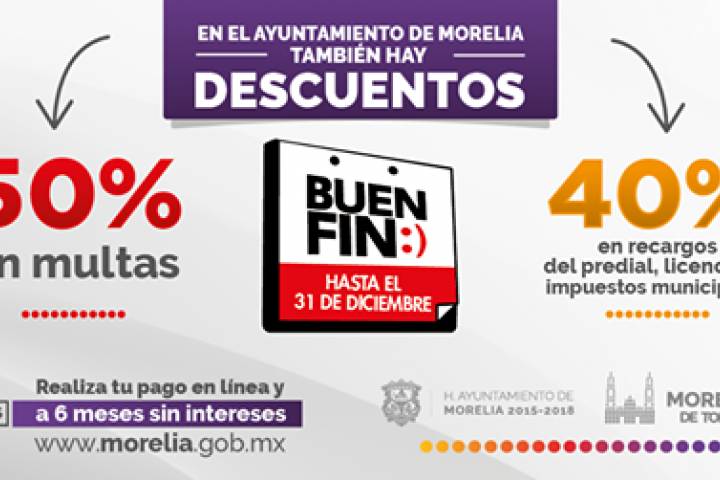 NOTICIAS 18/11/2016Tesorería Municipal invita a morelianos a aprovechar promociones del Buen Fin El Ayuntamiento de Morelia, a través de la Tesorería Municipal, invita a los contribuyentes capitalinos a aprovechar los descuentos en multas y recargos en todos los gravámenes municipales que con motivo del "Buen Fin" ofrece, en el ánimo de apoyar a la economía de las familias morelianas.