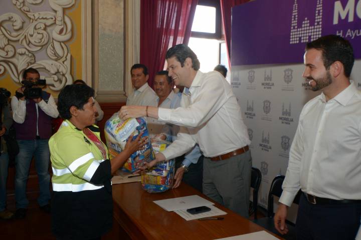 NOTICIAS 03/11/2016Alcalde reconoce labor de trabajadores de limpia El presidente municipal de Morelia, Alfonso Martínez Alcázar hizo justicia a 115 empleados que no tienen prestaciones laborales y que son parte del equipo de Limpia, con despensas les apoyó. Se trata de una bolsa que contiene cereal, chocolate en polvo, papel de baño y servilletas, arroz, frijoles, una lata de atún y un paquete de tubo de galletas.