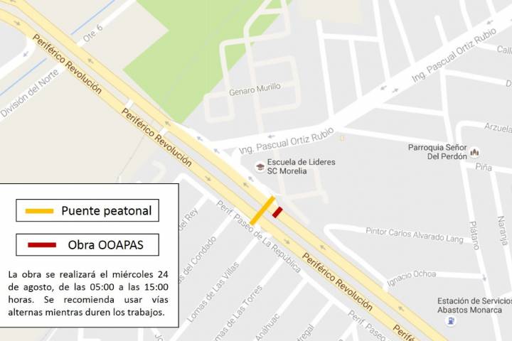 NOTICIAS 23/08/2016OOAPAS hará obra sobre Periférico Revolución El Organismo Operador de Agua Potable, Alcantarillado y Saneamiento de Morelia (OOAPAS) informa que el día de mañana miércoles 24 de agosto realizará un cruce de línea de agua potable sobre el Periférico Revolución para optimizar el servicio en la colonia Diego Rivera (también conocida como Lomas de las Canteras) y en las inmediaciones del Mercado de Abastos.