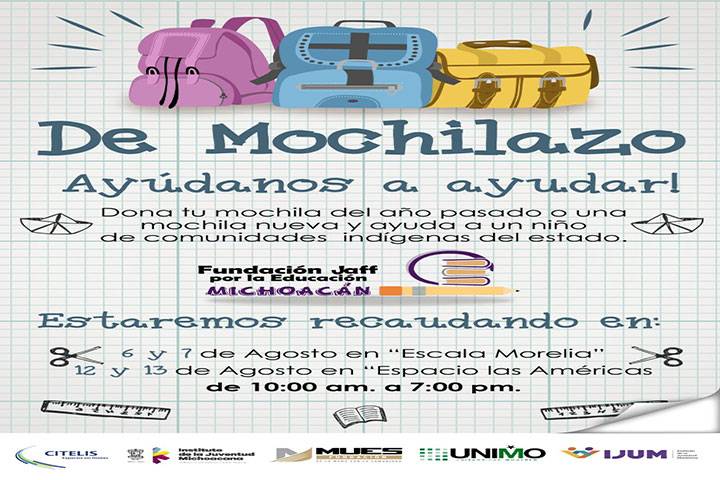 NOTICIAS 11/08/2016IJUM apoya la educación de los sectores más vulnerables Siguiendo las polÃticas del Presidente Municipal de Morelia, Alfonso MartÃnez, de establecer lazos de colaboración con instituciones y fundaciones que trabajan en beneficio de los sectores más necesitados de la población, el Instituto de la Juventud Moreliana (IJUM) se ha unido a la campaña "De Mochilazo, Ayúdanos a Ayudar" impulsada por la Fundación Jaff, quienes trabajan constantemente por la educación de los michoacanos.
